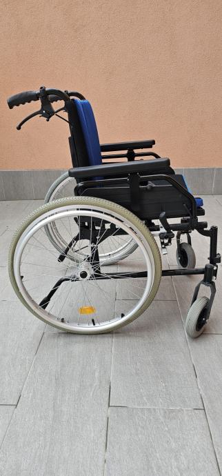 Standardna lagana invalidska kolica s veličinom sjedala od 50 cm, opremljena sklopivim X-okvirom od aluminija te sjedištem i naslonom od upijajuće tkanine u plavo-crnoj kombinaciji. Na kolicima se nalaze, kočnica za pratitelja, jastuk od spužve, sigurnosni pojas, oslonci za ruke podesivi po visini (koje je moguće jednostavno skinuti prilikom transfera), bez oslonaca za noge, stražnji sigurnosni kotačići te dvostruke kočnice (za korisnika i za pratitelja). Kolica dolaze s prednjim punim kotačima i stražnjim kotačima sa zračnicom opremljenim sustavom za brzo skidanje.