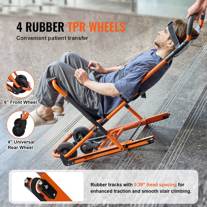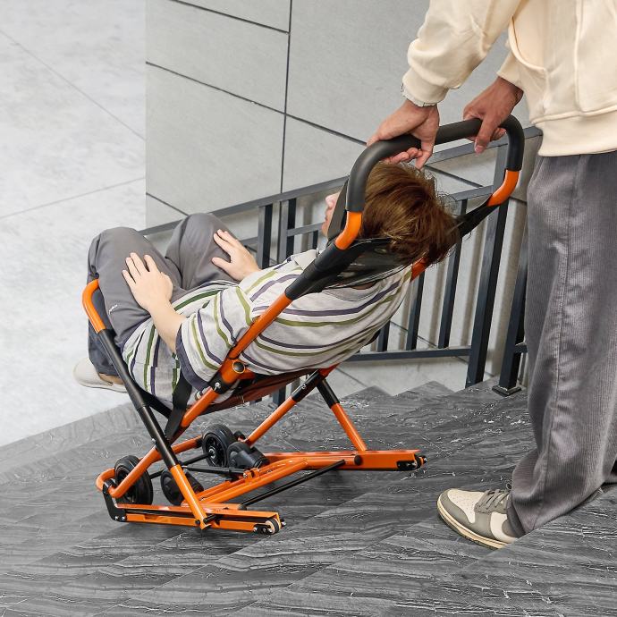 Vrlo lako i glatko klizite niz stepenice . Stolica ima ručke za rukovanje te četiri TPR gumena kotača. Dizajnirane za stepenice strme do 45°, gumene gusjenice ove stolice s razmakom gaznoga sloja od 0,39" omogućuju stabilan spust i brze prijenose bez napora. NAPOMENA: Koristi se samo pri spuštanju niz stepenice i nije prikladan za penjanje na kat.