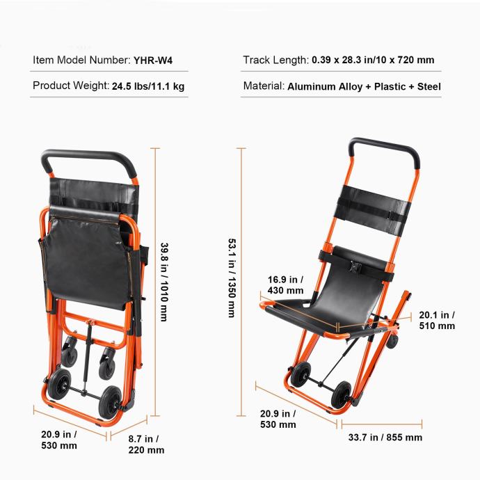 Stolica za stepenice je snažna, zahvaljujući aluminijskom i čeličnom okviru. S velikom proširenom dimenzijom od 33,7 x 20,9 x 53,1 inča i kapacitetom opterećenja od 160kg, savršen je za udobnu podršku širokom rasponu korisnika.