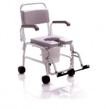 Kolica za tuš i kupaonicu. Konstrukcija u potpunosti od eloksiranog aluminija, sklopivi nasloni za ruke, bočne nagibne platforme, uklonjiva i podesiva duljina. Sjedalo i nasloni tapecirani PVC-om s toplinskom zaštitom. 4 okretna kotača od kojih prednji s kočnicom Ø 10 cm.