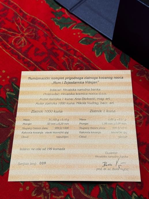 Numizmatički komplet izdaje se u seriji od svega 199 komada i radi se o posljednjim zlatnicima s apoenom kune. Zlatnik Hum nosi apoen od jedne kune a zlatnik Višnjan od 1000 kuna.