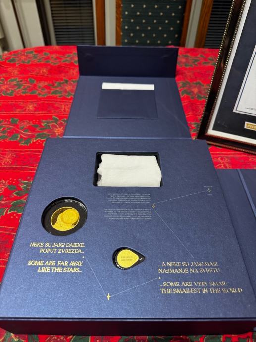 Dolazi u numizmatičkom kompletu sa zlatnikom od jedne unce zlata koji na sebi nosi motiv Zvjezdarnice Višnjan koja je na trećem mjestu u svijetu po broju objavljenih asistencija u određivanju kretanja malih nebeskih tijela.