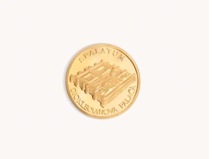 Naličje zlatnika: Dioklecijanova palača je antička palača cara Dioklecijana u Splitu koju je oko 300. god. sagradio rimski car Dioklecijan i u njoj boravio nakon povlačenja s prijestolja. Sagrađena je u uvali poluotoka 5 km jugozapadno od Salone, glavnoga grada provincije Dalmacije. Ostaci palače danas su dio povijesne jezgre Splita koja je upisana na UNESCO-ov popis mjesta svjetske baštine u Europi još 1979. god.