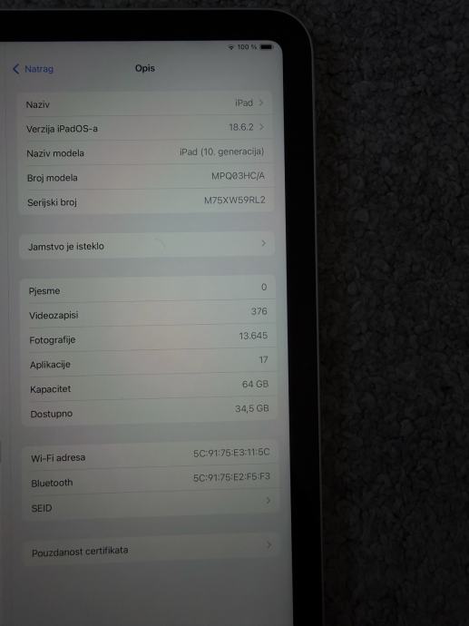Prodajem Apple iPad 10. generacije u srebrnoj boji 64 GB. Kupljen je krajem 2024. godine u fakultetske svrhe no nije se pokazalo korisnim (nije se koristio). Uređaj je potpuno ispravan i radi bez problema, nema ogrebotina, ništa nije mijenjano. Od prvog dana u futroli. Uz tablet dolazi i Apple Pencil u vrijednosti 100€, te dve futrole. Nažalost kutiju sam izgubila.
