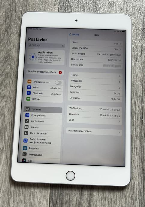 Apple iPad MINI pete generacije, 64gb, bijele boje - wifi model. Uređaj je potpuno ispravan, tek s minimalnim tragovima korištenja. Naravno, sve je moguće osobno isprobati.