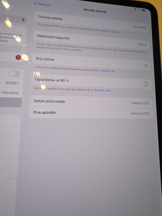 Baterija mu ima 42 ciklusa i 100% kapaciteta.