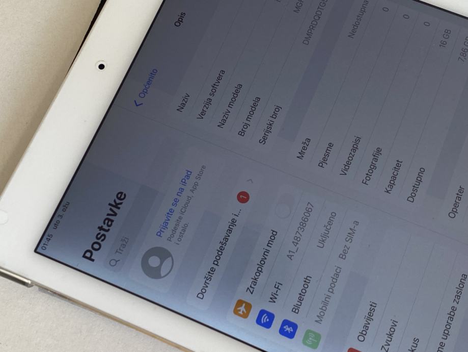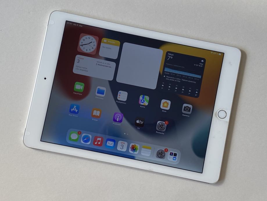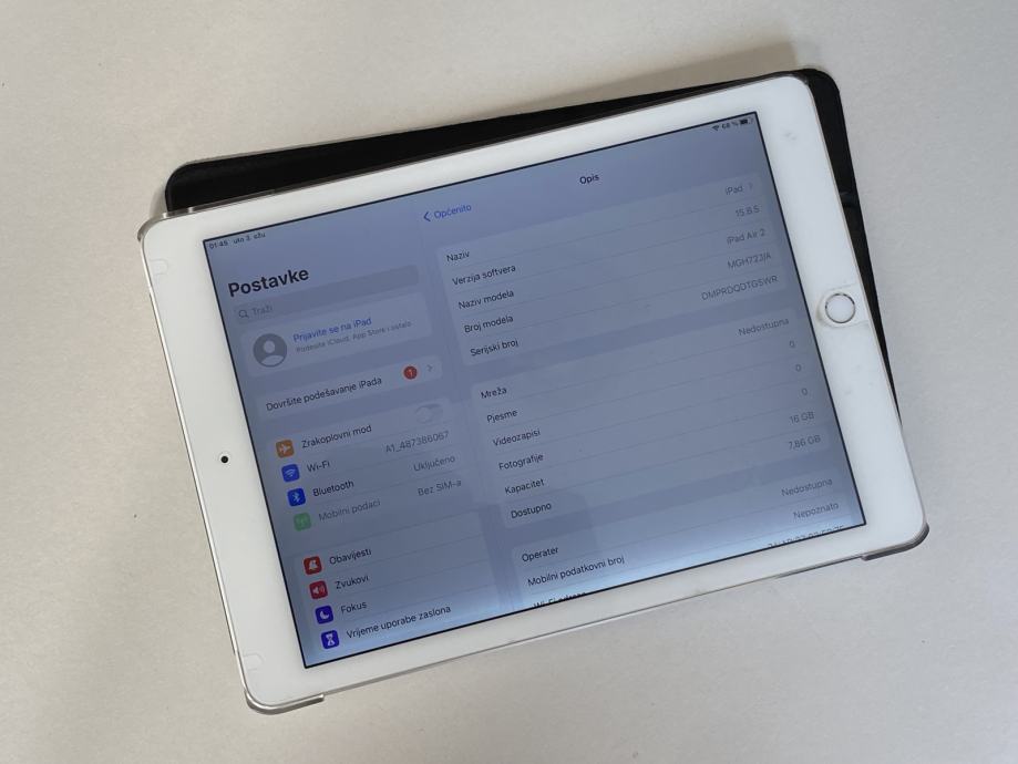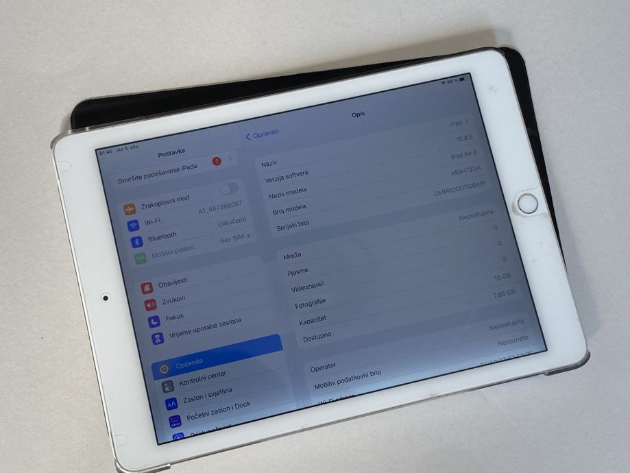 Prodajem tablet iPad Air 2, bijeli, model WiFi + 4G, 16 GB, vrti iOS 15.8.5. Tablet je u dobrom stanju, estetski vrlo uredan, ali na ekranu ima sivu crtu koja se vidi na svjetlijim pozadinama, te je pozadinsko osvjetljenje zaslona neujednačeno. Baterija dobra, uređaj je ispravan. Uz uređaj prilažem i kabel te adapter punjača, te etui vidljiv na fotografijama.