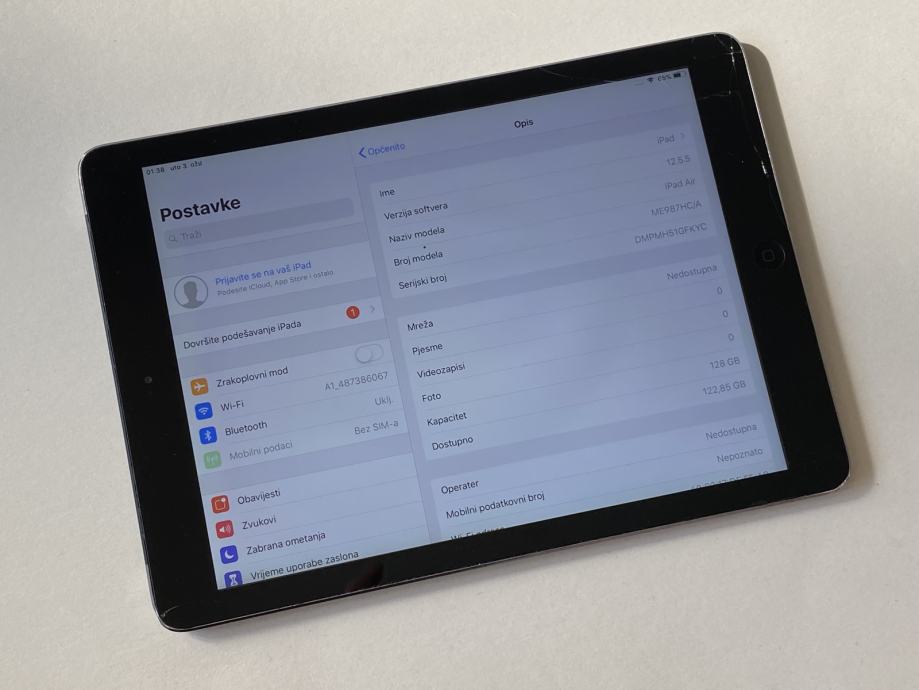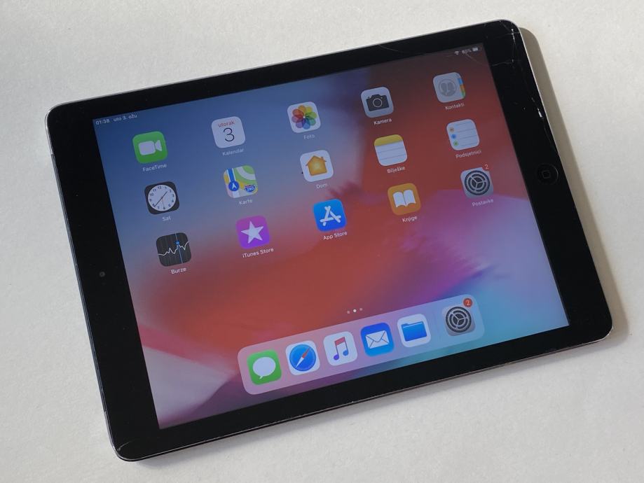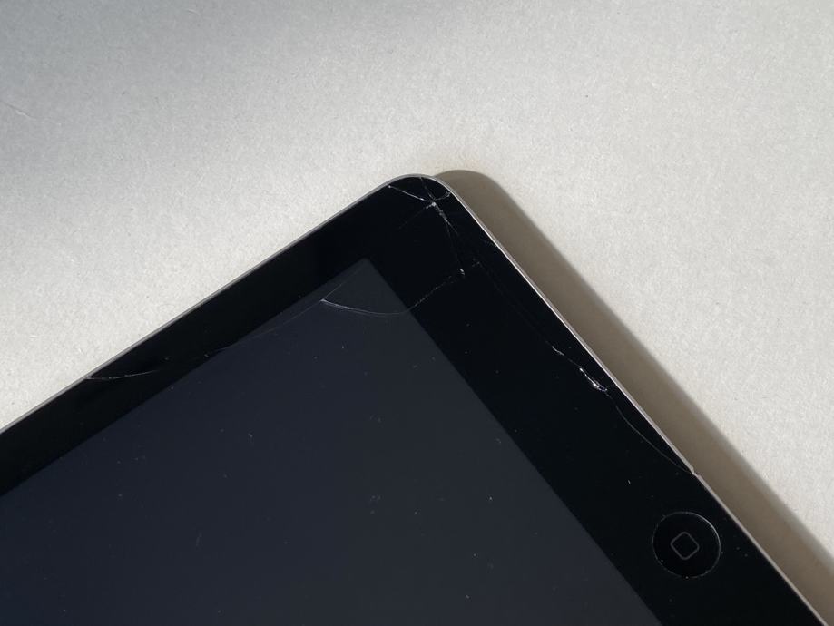 Prodajem tablet iPad Air (prve generacije), crni, model WiFi + 4G, 128 GB, vrti iOS 12.5.5. Tablet je u lošem kozmetičkom stanju, estetski ima ogrebotina i udubina, ekran je napukao. Mute switch povremeno šteka, ali je baterija dobra, i uređaj je ispravan. Uz uređaj prilažem i kabel te adapter punjača.
