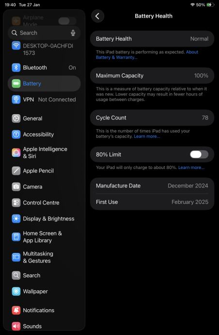 Tablet kupljen 12.2025, zdravlje baterije je 100% (78 ciklusa)