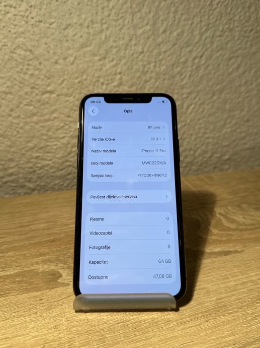 Prodajem rabljeni iPhone 11 Pro sa 64GB memorije i novom zamijenskim baterijom koja je 100% ispravna. Uređaj je u odličnom stanju, bez oštećenja i u potpunosti funkcionalan. Dolazi u elegantnoj crnoj boji s trostrukim kamera sistemom na stražnjoj strani.