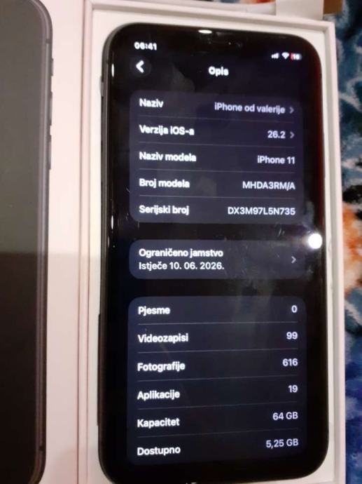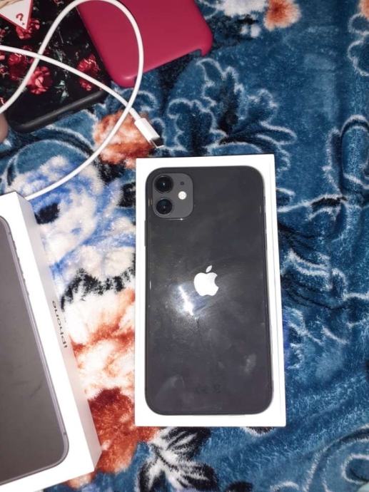 Prodajem iPhone 11 u crnoj boji s 64GB memorije. Telefon je potpuno ispravan, a baterija ima još 90% kapaciteta. Dolazi s originalnom kutijom, kablom za punjenje i dodatnim maskicama. Ograničeno jamstvo ističe 10. lipnja 2026. godine.