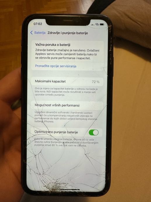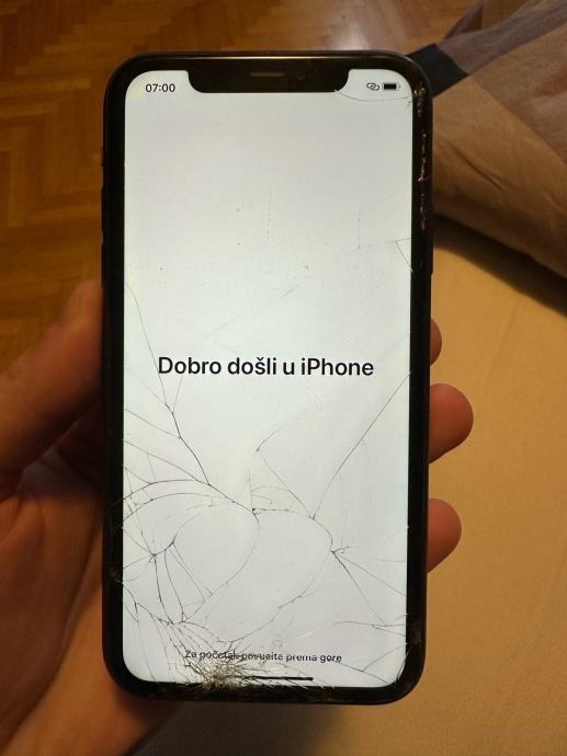 Prodajem koristeni iphone 11, razbijeno staklo, osim toga mobitel radi normalno, kamera dobra , baterija na 72%