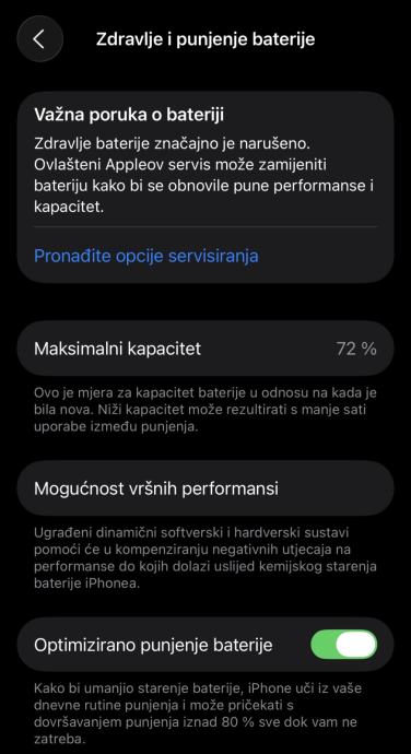 Zdravlje baterije 72% - u praksi aktivno korištenje 7-8h bez potrebe za punjenjem.