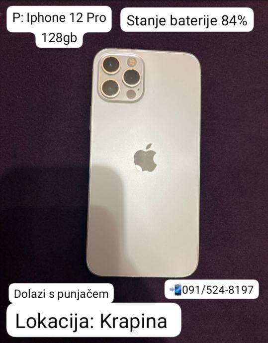 Prodajem iPhone 12 Pro sa 128GB memorije u bijeloj boji. Telefon je u rabljenom stanju, a baterija trenutno ima kapacitet od 84%. Uz telefon dolazi punjač.