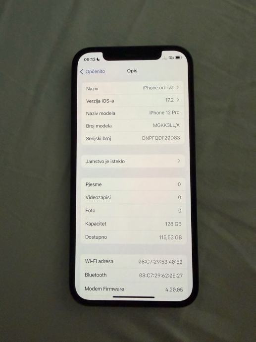 Prodajem rabljeni iPhone 12 Pro u plavoj boji (Pacific Blue). Uređaj ima 128 GB unutarnje memorije, 85% kapa is baterije.