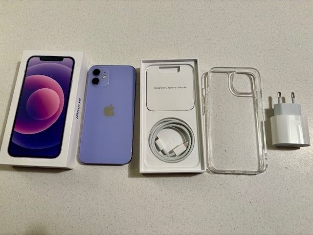 Apple iPhone 12 Purple 128GB, kupljen 06.2021. u T-Comu, radi na sve mreže, bez tragova korištenja, stanje 10/10, nova originalna baterija 100% (račun), Spigen maskica nekorištena, punjač i kutija. Razlog prodaje: kupnja novog uređaja.