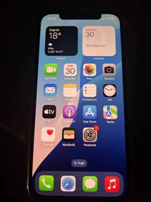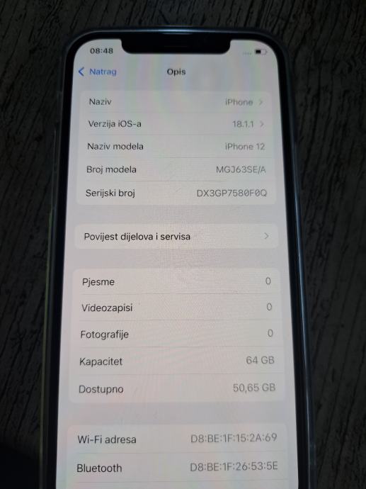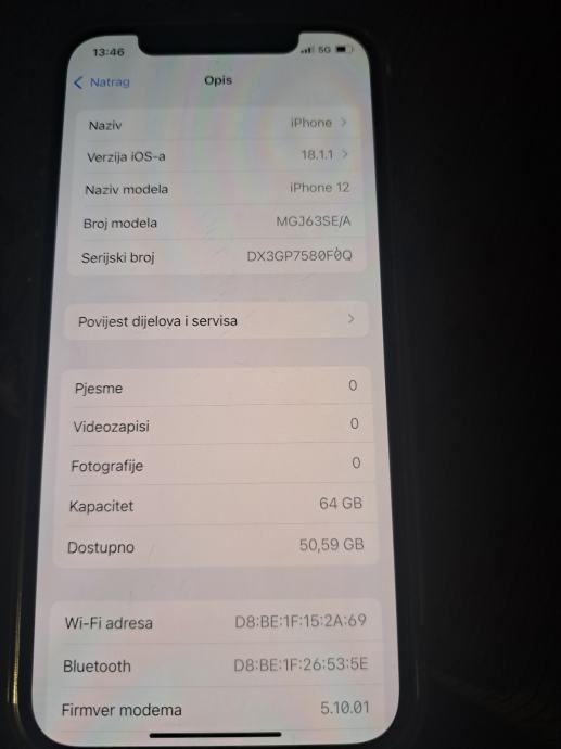 Prodajem rabljeni iPhone 12 s kapacitetom 64 GB u bijeloj boji. Uređaj ima iOS 18.1.1 verziju i 50,65 GB dostupnog prostora za pohranu. Baterija je na 76% dostupan SMS inbox 0919235124 ocuvan bez oštećenja.