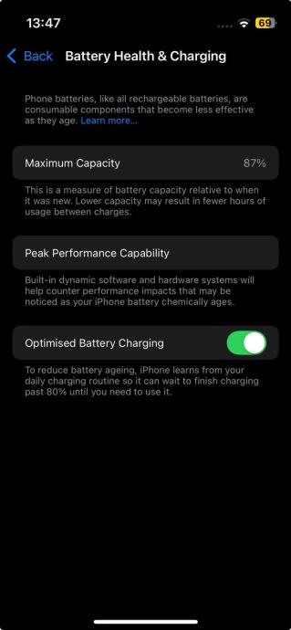 Maksimalni kapacitet baterije je 87% (može se vidjeti na fotografiji).