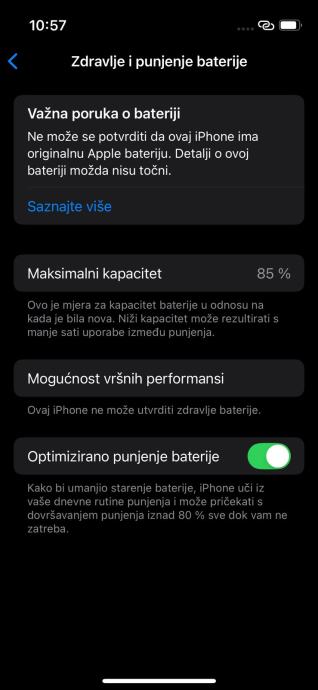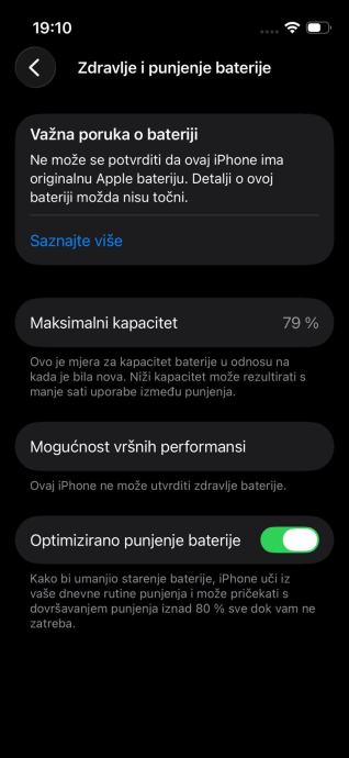 Zamijenjena 18.12.2024. u ovlaštenom Apple servisu (imam račun kao dokaz). Ugrađena je zamjenska (neoriginalna) baterija pa iOS ne prikazuje točno stanje zdravlja baterije.