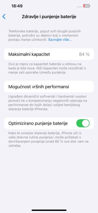 Zdravlje baterije 84%, no odlično drži cijeli dan bez problema.
