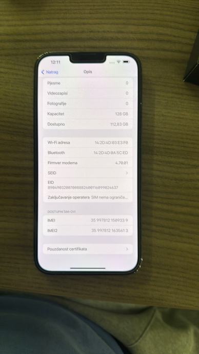 Prodajem iPhone 13 Pro Max sa 128GB memorije. Radi se o modelu u Sierra Blue boji s trostrukim kamerama i ProMotion ekranom. Telefon radi besprijekorno, sve funkcije su ispravne. Iskoristite priliku za solidnu uštedu.