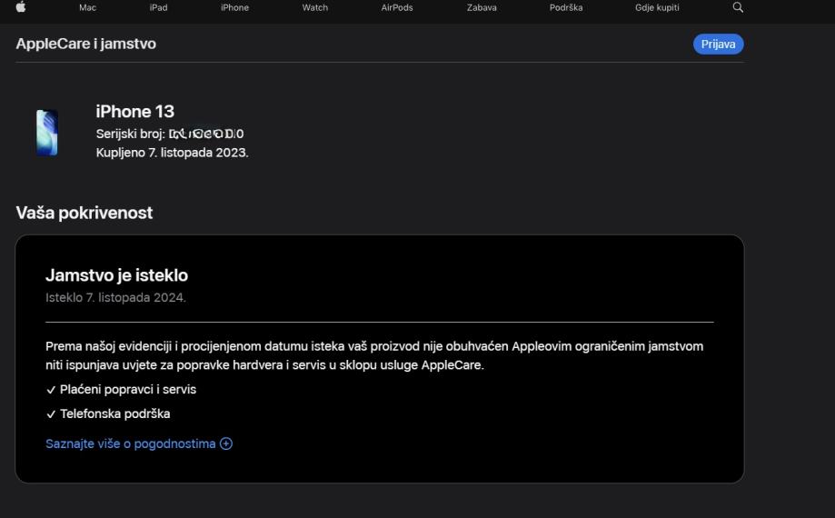 Prilažem screenshot službene Apple provjere s datumom kupnje