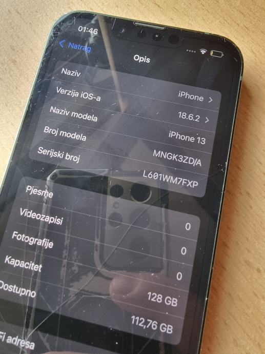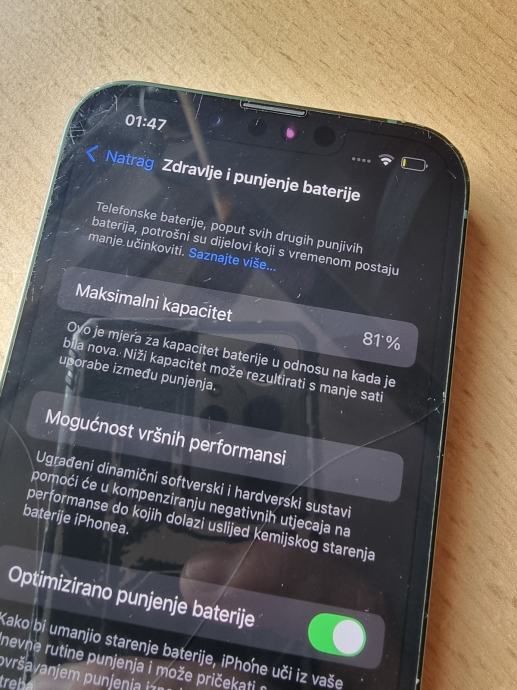 Mobitel je u ispravnom stanju, sve radi, icloud otključan, zdravlje baterije na 81%, 128gb, green