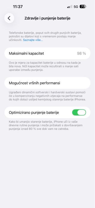 Originalna baterija je u odličnom stanju s kapacitetom 98%, što osigurava dugotrajno korištenje između punjenja. Uređaj ima dvojni sustav kamera koji omogućuje snimanje visokokvalitetnih fotografija i videozapisa.