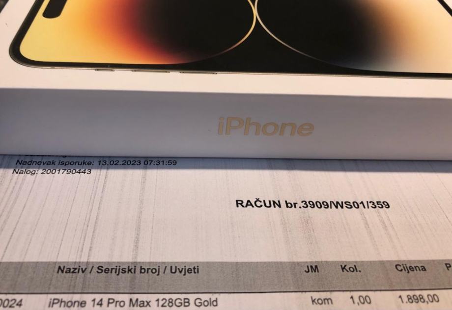 Prodajemo Apple iPhone 14 Pro Max 128GB. Uređaj je nov i zapakiran, kupljen je 13.02.2023. te posjedjue račun i garanciju.
