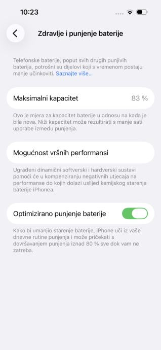 Mobitel je u odličnom stanju, zdravlje baterije 83% – korištenje cijeli dan.