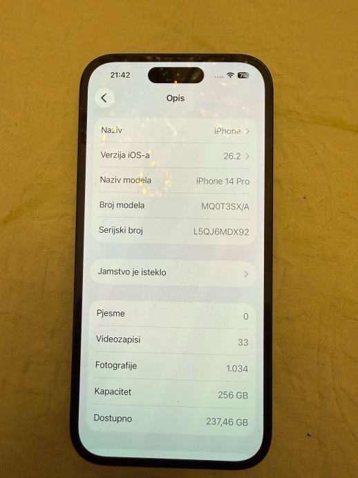Prodajem 14 pro 256gb , radi na sve mreže. Stanje odlicno , zdravlje baterije je 85% i drži cijeli dan.