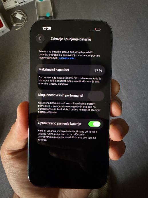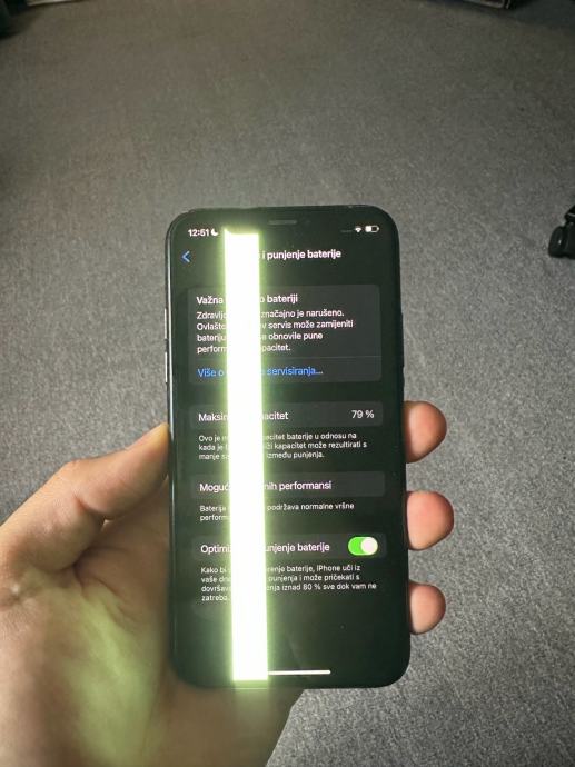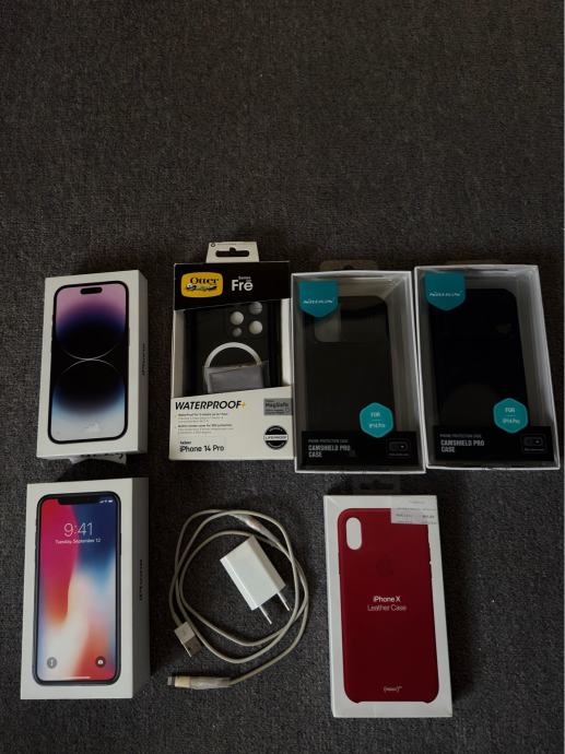 Skupa sa njim šaljem iPhone X 64gb sa svom originalnom ambalažom, slušalicama na kabel i sa novom ugrađenom baterijom, ali sa malim oštećenjem ekrana. Sam sam kupio novu bateriju, potrebne alate i valjda tijekom stavljanja sam nešto krivo stavio radi čega ekran ima zelenu crtu. Mislim da ga samo treba ponovno otvorit i zatvorit ili odnest na servis da riješe. Zdravlje baterije piše 79% a baterija je NOVA, tako da to mi nije jasno, ali mobitel je odličan. Uz iPhone 14 Pro nije došao punjač, samo kabel, a uz iPhone X je došao kabel i punjač. Taj punjač sam koristio za oba mobitela.