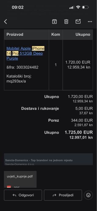 Kao što je navedeno, prodajem iPhone 14 Pro Deep Purple boje sa 512gb memorije maksimalno očuvan, sa 2 Nillkin Camshield maskice koje imaju poklopac za zaštitu kamere (jedna je stara, druga je svježe nova kupljena), Otterbox Fre (najbolja vodootporna maskica za 2m dubine 73€ placena), zdravlje baterije je na 87% i drži cijeli dan bez problema. Mobitel sam kupio sa Sancta Domenice webstranice za 1725€ 2023. te dolazi sa svom papirologijom i originalnom ambalažom.