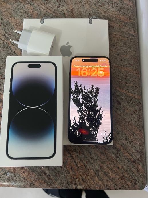 Prodajem rabljeni iPhone 14 Pro u crnoj boji (Space Black). Uređaj dolazi s originalnom kutijom i punjačem.