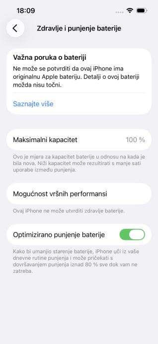 Napomena: Baterija u postavkama prikazuje poruku o nepoznatom dijelu, ali to ne smeta za rad.