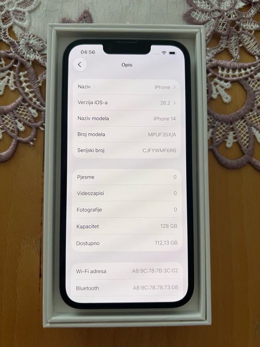 Prodajem potpuno novi iPhone 14 sa 128GB memorije, u besprijekornom stanju kao da je tek izvađen iz trgovine. Uređaj dolazi sa kutijom sa svom pripadajućom opremom, te ima ažuriran iOS sustav. Izgleda kao da nikada nije korišten, bez ijedne ogrebotine ili znakova uporabe. Uz mobitel dobijate punjač i maskicu. Mobitel je od prvog dana u maskici.