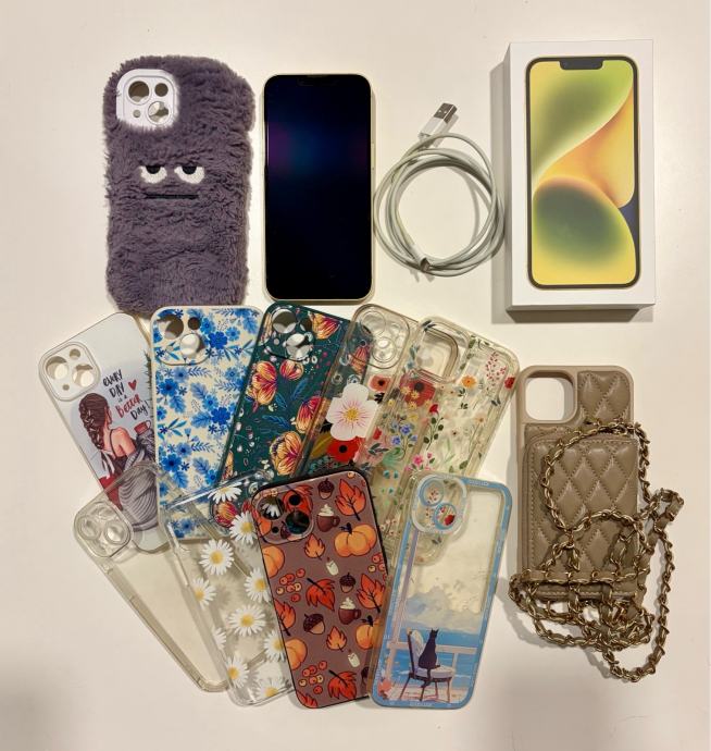 iPhone 14 256GB u savršenom stanju i rijetkoj žutoj boji. Telefon dolazi s pravom kolekcijom maskica – preko 10 komada u raznim stilovima i dizajnima, od prozirnih s cvijetnim motivima, zabavnih s likovima, elegant quilted zlatne maskice s lancem, do plišane ljupke maskice. Za različite ukuse, događaje i godišnja doba - stilski za stilsku!