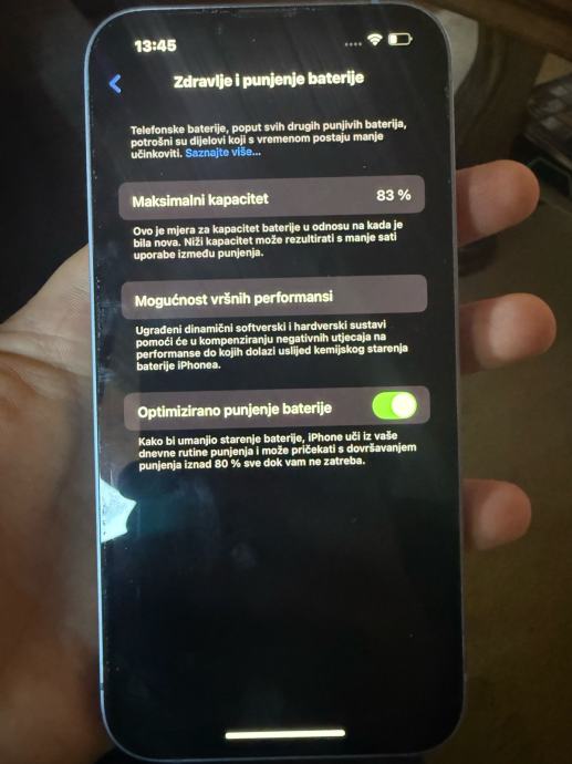 iPhone 14 plave boje, 128gb, mobitel je u super stanju, 83% baterije. Malo ostecenje na rubu (ekran netaknut jer je imao zastitno staklo).