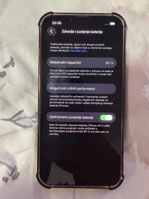 Baterija na 85% zdravlja, uz uređaj dajem i nekoliko maskica (ženske), kaljena stakla, kabel za punjač i slušalice.