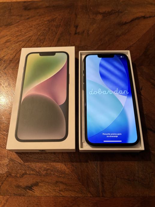 Crni Iphone 14. Mobitel dolazi sa originalnom kutijom, kablom, iglom, računom i ostalim papirima. Na dan kad je kupljen na ekran je stavljeno zaštitni staklo te na stražnju stranu isto i mobitel je čitavo vrijeme bio u silikonskoj zaštitnoj maskici.