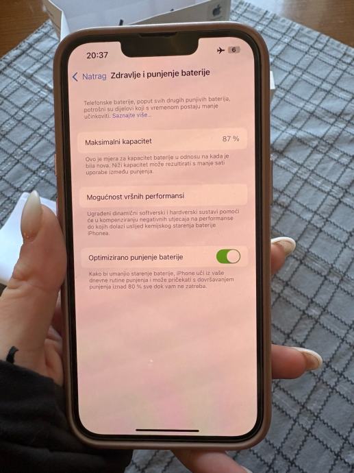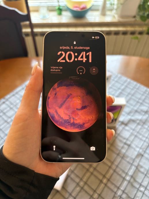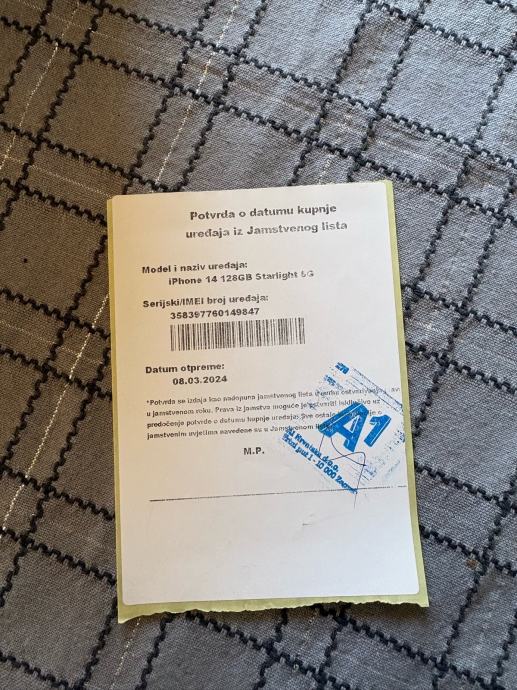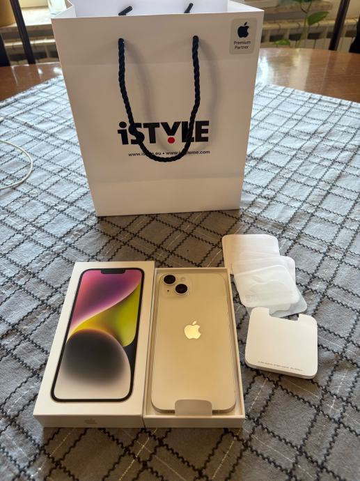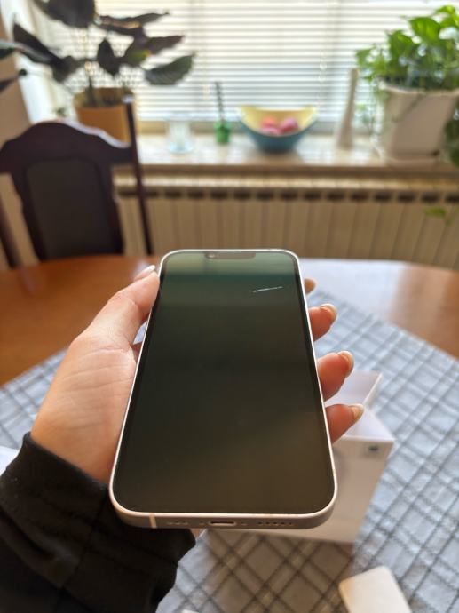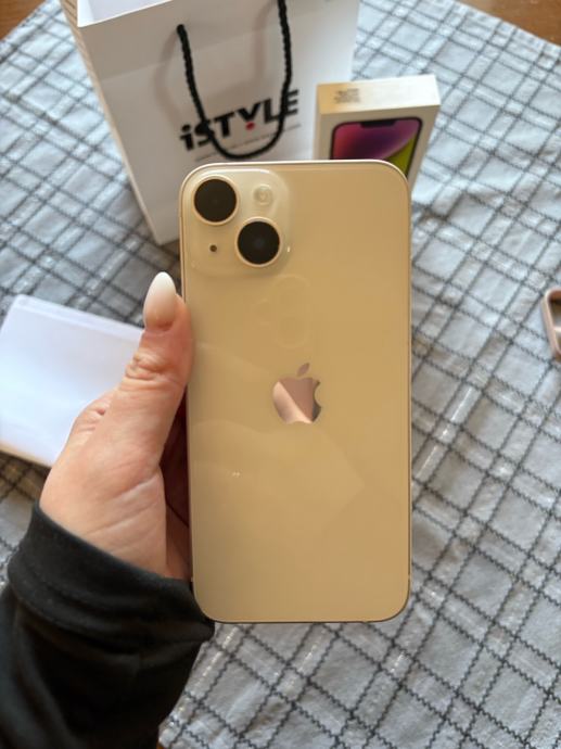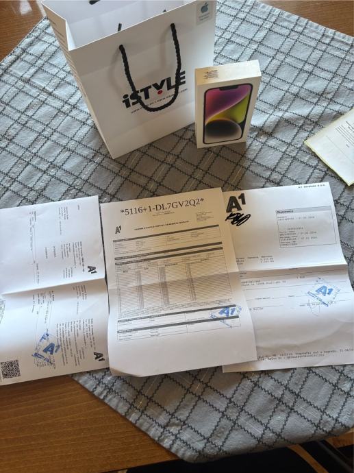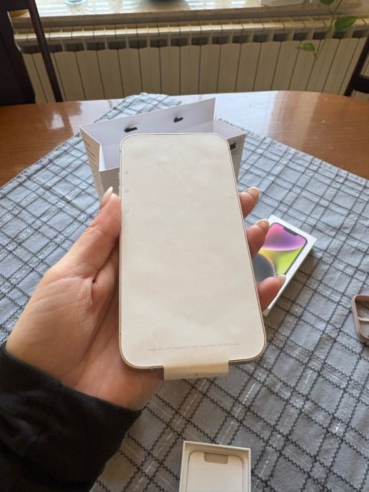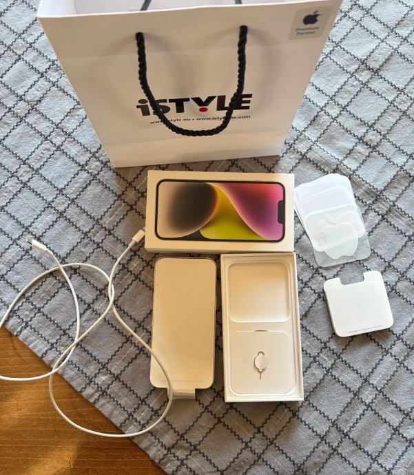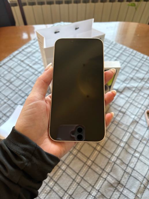 Pozdrav, prodajem iphone 14, kupljen u 3. mjesecu 2024. i korišten do ljeta 2025. godine te od tada stoji u ladici. Baterija je na 87%. Na zadnjim slikama su vidljive dvije male ogrebotine, jedna na ekranu koja se vidi samo na suncu te jedna sitna na rubu mobitela. Svi papiri za mobitel, punjač, vrečica i kutija sa svim prikazanim na slici, dolaze uz mobitel. Za ostala pitanja slobodno se javite.