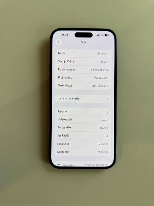 Prodajem iPhone 15 Plus, crne boje, kapaciteta 256GB. Uređaj kupljen 2/2024, korišten pažljivo i uvijek nošen u maskici.