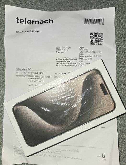 Novi, tvornički zapakiran Apple iPhone 15 pro max 512 gb s računom od 17.12.2025. prodajem.