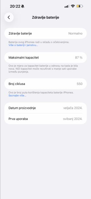 Mobitel je kao nov, bez mane. Nema niti jednu ogrebotinu. Zdravlje baterije je na 87%.