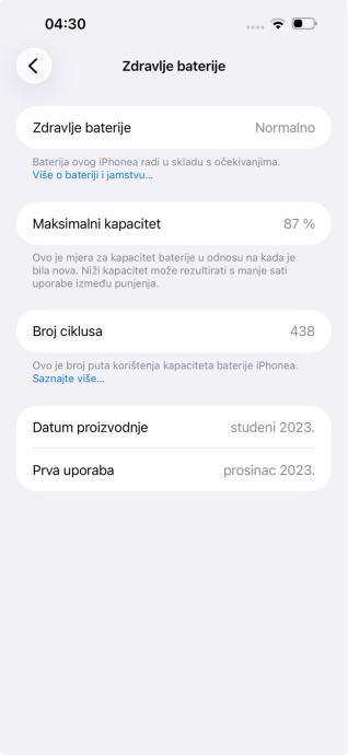 Prodajem rabljeni iPhone 15 Pro Max 256 GB (Black Titanium), star dvije godine, u odličnom stanju. Kaljeno staklo od prvog dana. Dolazi u originalnoj kutiji s originalnim kabelom i maskicom. Zdravlje baterije je 87%. Bez zamjena. Preferiram primopredaju.