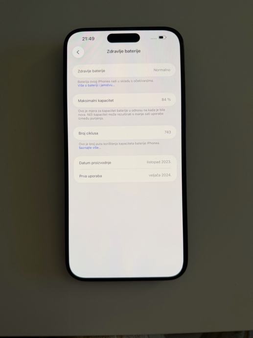 Mobitel je star nepunih 2 godine, bez tragova korištenja, od prvog dana maska i kaljeno staklo. Zdravlje baterije je 84%, ali cijeli dan izdrži bez problema unatoč aktivnom korištenju, što se vidi i po ciklusu punjenja unazad te 2 godine.