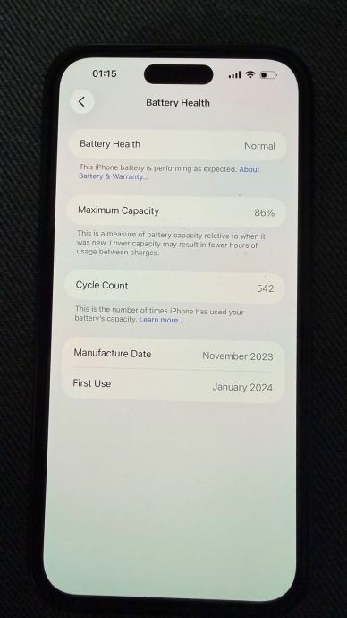 Prodajem iPhone 15 Pro Max u crnoj boji (titanij). Telefon je potpuno ispravan i radi bez problema. Kapacitet baterije je 86%, što je potvrđeno u postavkama. Uređaj dolazi s originalnom kutijom i dvije maskice (prozirna nije koristena).