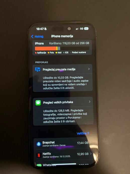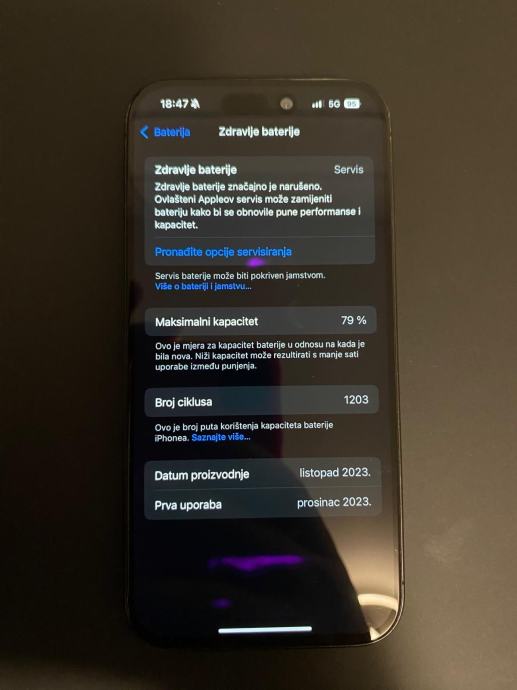 Prodajem rabljeni iPhone 15 Pro u ispravnom stanju. Mobitel ima kapacitet baterije 79% i prvu uporabu od prosinca 2023. Uređaj je u zadovoljavajućem stanju unatoč manjim oštećenjima na kućištu.