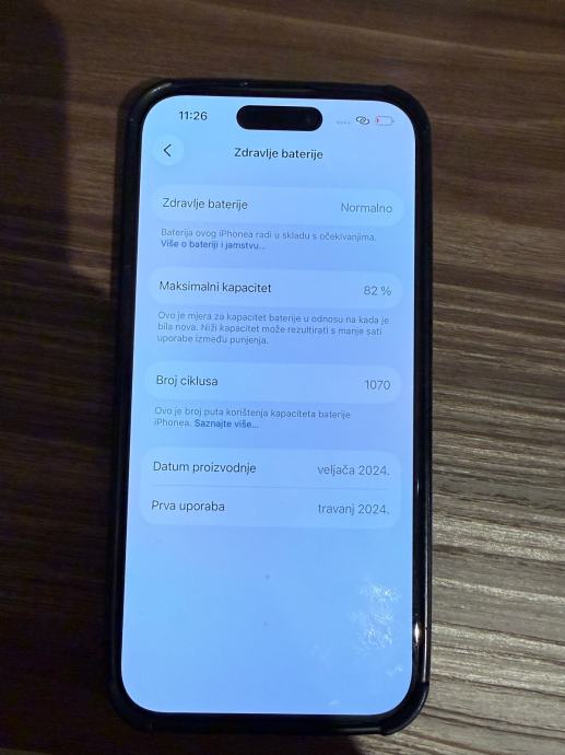 Prodajem iPhone 15 Pro sa 128GB memorije. Telefon je u sivoj boji (natural titanium), a radi se o rabljenom uređaju koji je u funkcionalnom stanju. Uređaj ima 1070 ciklusa punjenja, maksimalni kapacitet baterije je 82%, a datum proizvodnje je veljača 2024. godine. Telefon je prvi put pokrenut u ožujku 2024. godine.