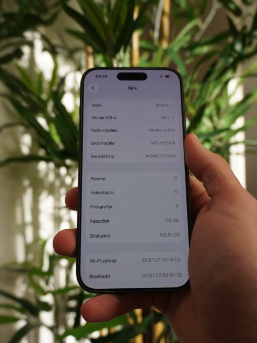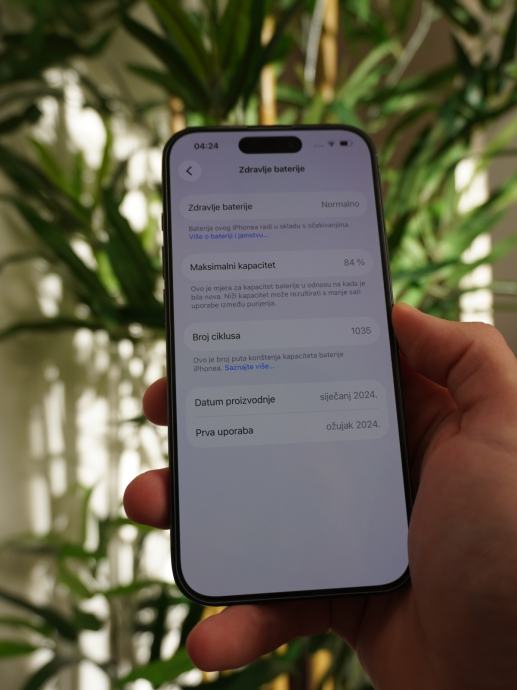 Prodajem iPhone 15 Pro u Black Titanium (crnoj) boji s 128 GB pohrane. Zdravlje baterije je na 84%, iCloud otključan te je mobitel potpuno ispravan. Dobro je očuvan, nema gotovo nikakvih tragova korištenja. Uz mobitel dajem kutiju, prozirnu maskicu, a uz nadoplatu i Apple plavu silikonsku maskicu